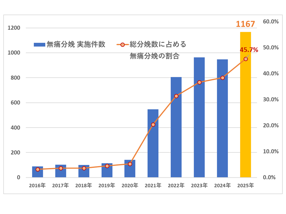 2025年は年間1,167件の実績があり、さらにご希望のほぼすべての患者さまに無痛分娩を提供できました。
